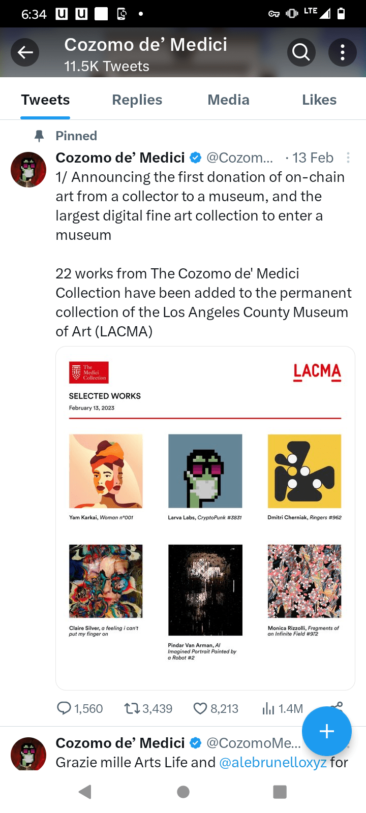 1/ Announcing the first donation of on-chain art from a collector to a museum, and the largest digital fine art collection to enter a museum22 works from The Cozomo de’ Medici Collection have been added to the permanent collection of the Los Angeles County Museum of Art (LACMA)